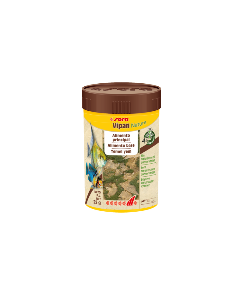 sera Vipan Nature é o alimento base composto por flocos flutuantes sem corantes nem conservantes para todos os peixes ornamentais que se alimentam na superfície.