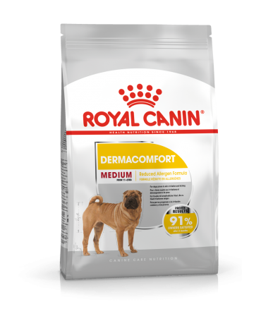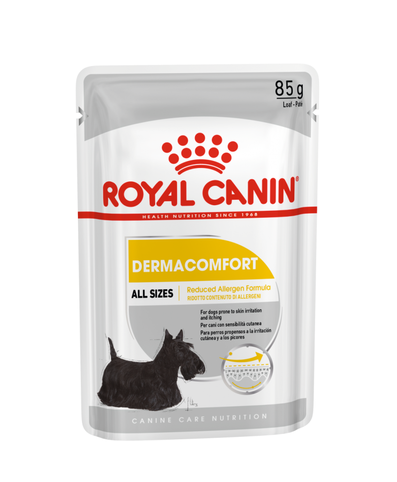 As irritações cutâneas são o principal motivo das consultas veterinárias. A sensibilidade cutânea e a comichão excessiva podem causar ferimentos na pele do seu cão e inclusive provocar uma infeção. É possível acalmar a sensibilidade cutânea fornecendo uma dieta com nutrientes apropriados a essa condição. O ROYAL CANIN® Dermacomfort em patê está enriquecido com ácidos gordos Ómega 3 e 6 que ajudam a acalmar e a proteger a pele do seu cão, tornando-a também menos sensível aos agentes irritantes ambientais. As selecionadas fontes de proteína incluídas no ROYAL CANIN® Dermacomfort em patê, ajudam a reduzir o risco de intolerância. Esta deliciosa receita é rica em proteínas cuidadosamente selecionadas de baixo potencial alergénico, que foram exclusivamente selecionadas de acordo com as necessidades do seu cão. Além disso, cuidar do seu cão proporcionando-lhe um alimento que contém nutrientes de elevada qualidade não só estará a ajudar a cuidar da sua pele sensível, como também estará a ajudá-lo a manter a vitalidade e saúde da sua pelagem. O ROYAL CANIN® Dermacomfort em patê é indicado para cães de todos os tamanhos. Para além deste delicioso patê, o nosso programa nutricional Dermacomfort oferece também um estaladiço croquete. Ambos são nutricionalmente completos e complementam-se na perfeição. Por que não experimentar oferecer o patê como uma deliciosa cobertura do croquete?