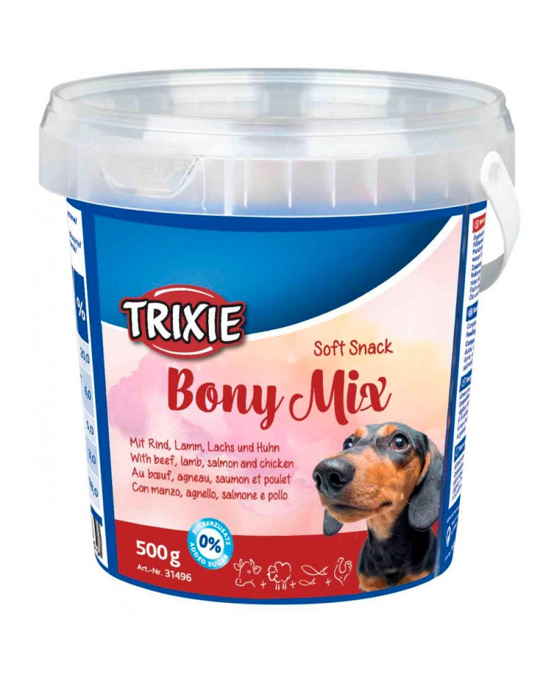 Os Soft Snacks Bony Mix possuem na sua composição uma variedade de sabores como carne de vaca, cordeiro, salmão e frango, prometendo fazer as delícias dos patudos. A receita sem açúcares adicionados, para além de ser benéfica para a saúde do cão, ajuda a controlar o seu peso. O balde com tampa hermética, mantém as propriedades do alimento por mais tempo, ajudando a conservar a sua frescura.