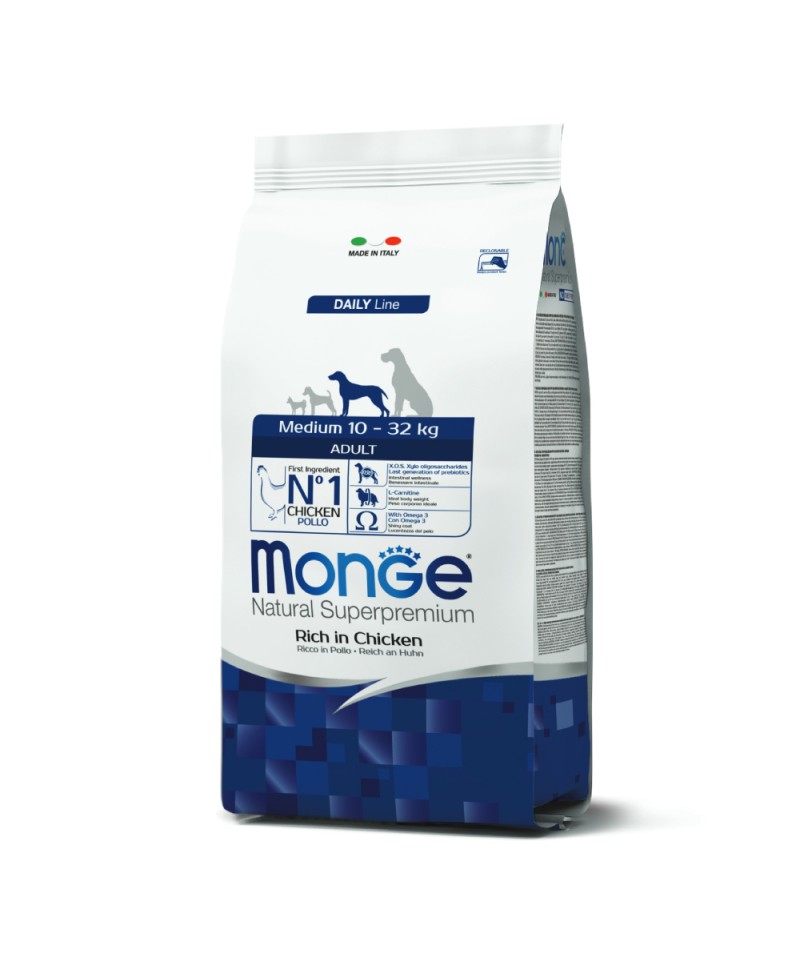 Monge Natural Superpremium Medium Adulto é um alimento completo para cães de pequeno porte. Este alimento garante o bem-estar do seu animal, devido à utilização de nutrientes com elevada qualidade. Tendo como principal ingrediente o frango, esta formulação é caracterizada pela elevada palatabilidade e digestibilidade, devido à incorporação de carne fresca. A presença de XOS (Xilo-oligossacarídeos), a última geração de prebióticos, garantem o bem-estar intestinal. Esta fórmula contém também L-Carnitina para dar promover o peso corporal ideal, e uma relação otimizada de omega-6 / omega-3 e aporte de óleo de salmão contribuem para uma pele e pelo saudáveis. Sem corantes ou conservantes artificiais adicionados.