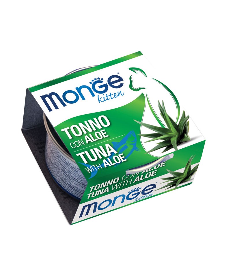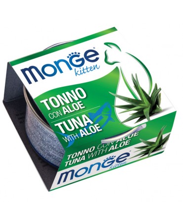Monge Fruits Atum com Aloe é um alimento complementar equilibrado para gatinhos, preparado com ingredientes selecionados pela sua frescura e preparados ao vapor para aumentar a palatabilidade e sabor. Esta receita tem como principal ingrediente o atum, enriquecida com aloe vera, para o suporte da pele e do pelo e com fruto-oligossacarídeos (FOS), que são prebióticos indispensáveis ao bem estar intestinal. Esta fórmula promove as atividades diárias de um gatinho com elevada energia. Sem corantes ou conservantes artificiais adicionados.