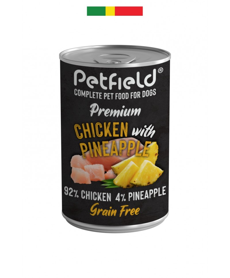 Alimento húmido sem cereais para cães. Sabor a Frango e Ananás.