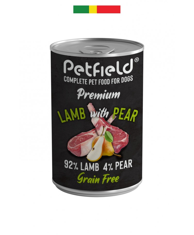 Alimento húmido sem cereais para cães. Sabor a Borrego e Pera.