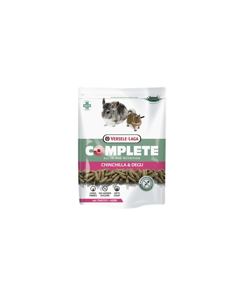 Versele-Laga Complete Chinchilla & Degu é uma nutrição sem preocupações. Os pellets "tudo em um" excecionalmente saborosos evitam comportamentos alimentares seletivos. Desta forma, a sua chinchila ou degu obtém todos os nutrientes essenciais e mantém-se perfeitamente saudável. A alimentaçõ sem adição de açúcares mantém os animais vitais e em ótimas condições. A linhaça é uma fonte de ómega 3 para uma pelagem saudável, e as fibras longas para uma digestão ótima, são especificamente adaptadas às necessidades nutricionais das chinchilas e dos degus. Versele-Laga Complete Chinchilla & Degu é desenvolvida por veterinários, com base em conhecimentos científicos avançados.