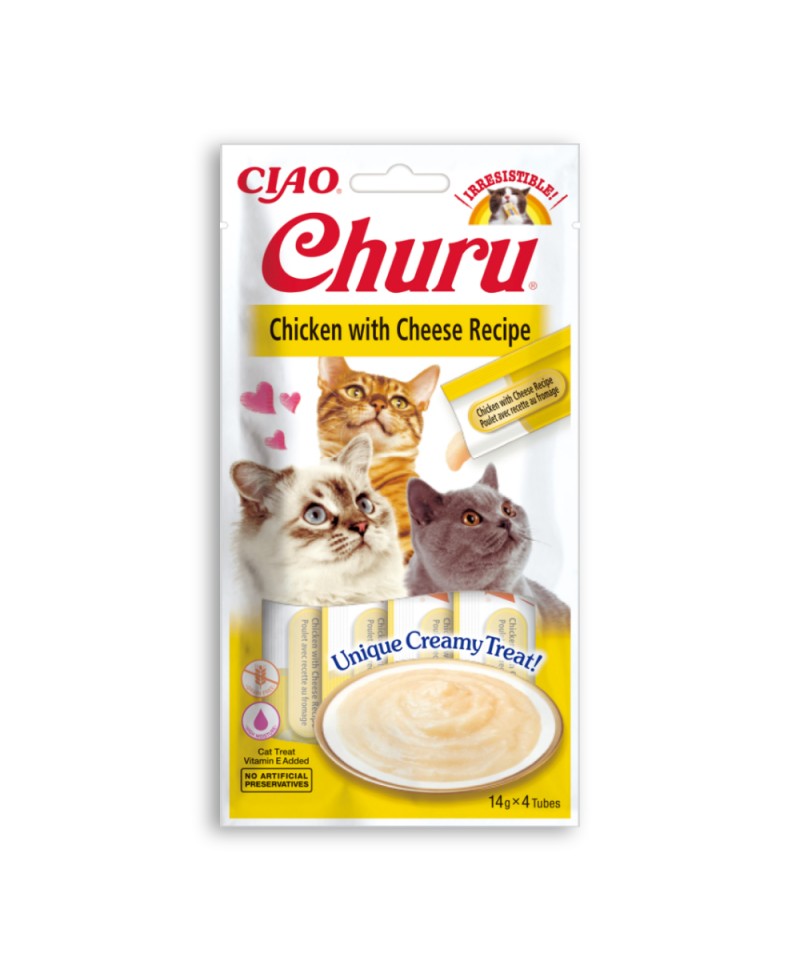 Snack cremoso com baixas calorias e fácil de espremer, para gatos. Sabor a Frango e Queijo.