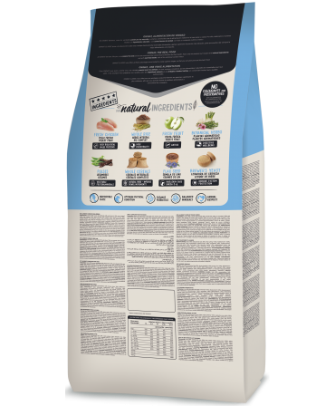 Carnes 39% (carnes desidratadas 29%, frango fresco* 10% antes da extrusão), arroz integral* (12%), trigo integral* (9%), gordura de frango, milho integral* (8%), farelo de trigo* (8%), cevada integral* (7%), ervilhas inteiras* (2%), maçã* (1%), óleo de salmão, sementes de linhaça* (1%), polpa de beterraba, fruto-oligossacarídeos e mano-oligossacarídeos, levedura de cerveja* (0,5%), plantas aromáticas 0,02% (funcho*, equinácea*, tomilho*), yucca schidigera. *INGREDIENTES NATURAIS