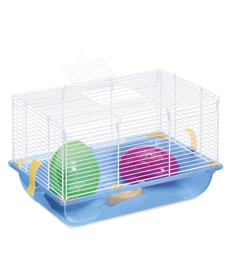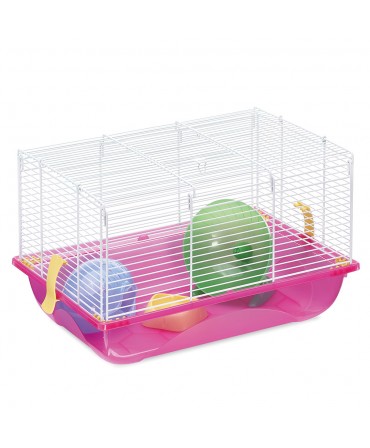 - Gaiola confortável equipada com um comedouro, uma roda e um ninho para descanso ou esconderijo. - Possui uma porta com um gancho de segurança na parte superior para inserir facilmente a comida e controlar o animal. - Os ganchos laterais permitem prender/desencaixar o fundo da estrutura, para uma fácil manutenção. - Dimensões: 44x26x23 cm - Cores sujeitas a alteração