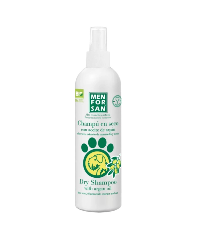 Champô seco para cães à base de óleo de argão, aveia e aloé vera. O óleo de argão tem propriedades nutritivas para a pele, o aloé vera hidrata e atua na pele sensível, e a aveia proporciona brilho, elasticidade e suavidade ao pelo.