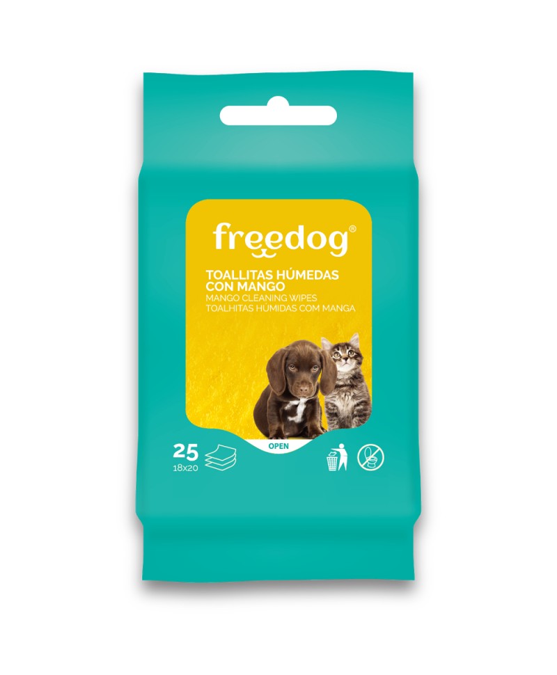 As toalhitas húmidas Freedog são perfeitas para ter sempre à mão na higiene do seu animal de estimação, eliminando os maus odores e limpando a fundo o pelo e as patas após o passeio diário. As toalhitas Freedog são também recomendáveis na higiene e limpeza da cara, orelhas e zona anal.