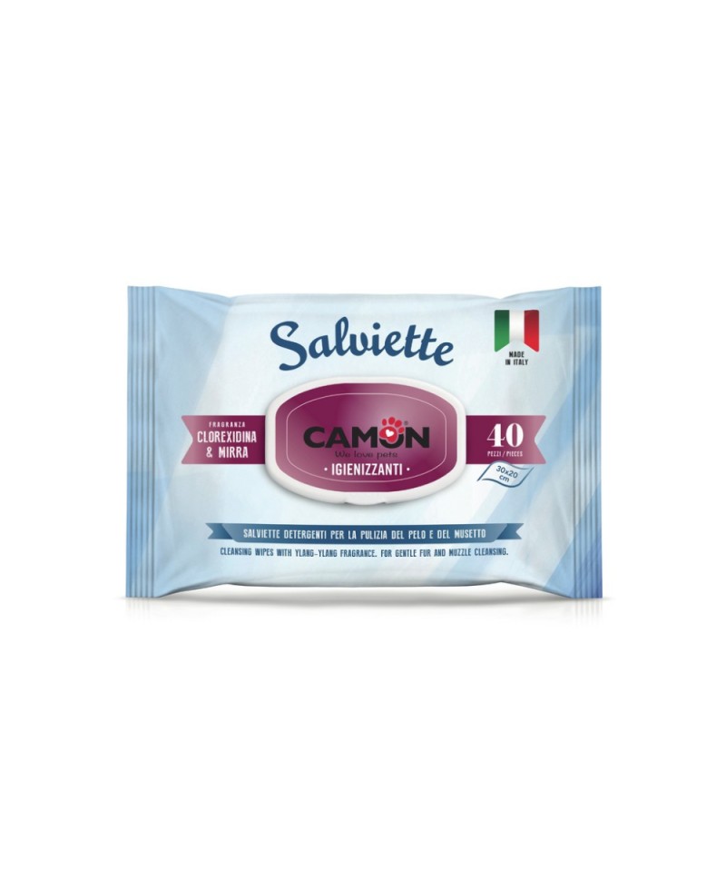 Toalhitas húmidas para limpeza de pelo de cães e gatos, com Clorexidina e aroma a Mirra.
