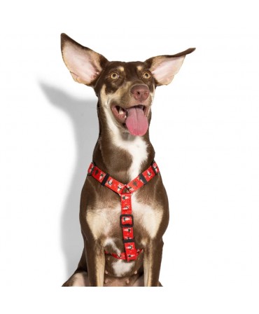 Peitoral em formato H para cães, temático ao Natal com motivos da rena Rudolfo.