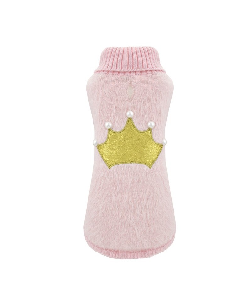 Divertido suéter de malha decorado com uma grande coroa de glitter dourado e missangas simulando pérolas. Fabricado com materiais quentes e de alta qualidade que se adaptam perfeitamente ao corpo do nosso animal de estimação. Com ilhó para a alça e elástico para a cauda.