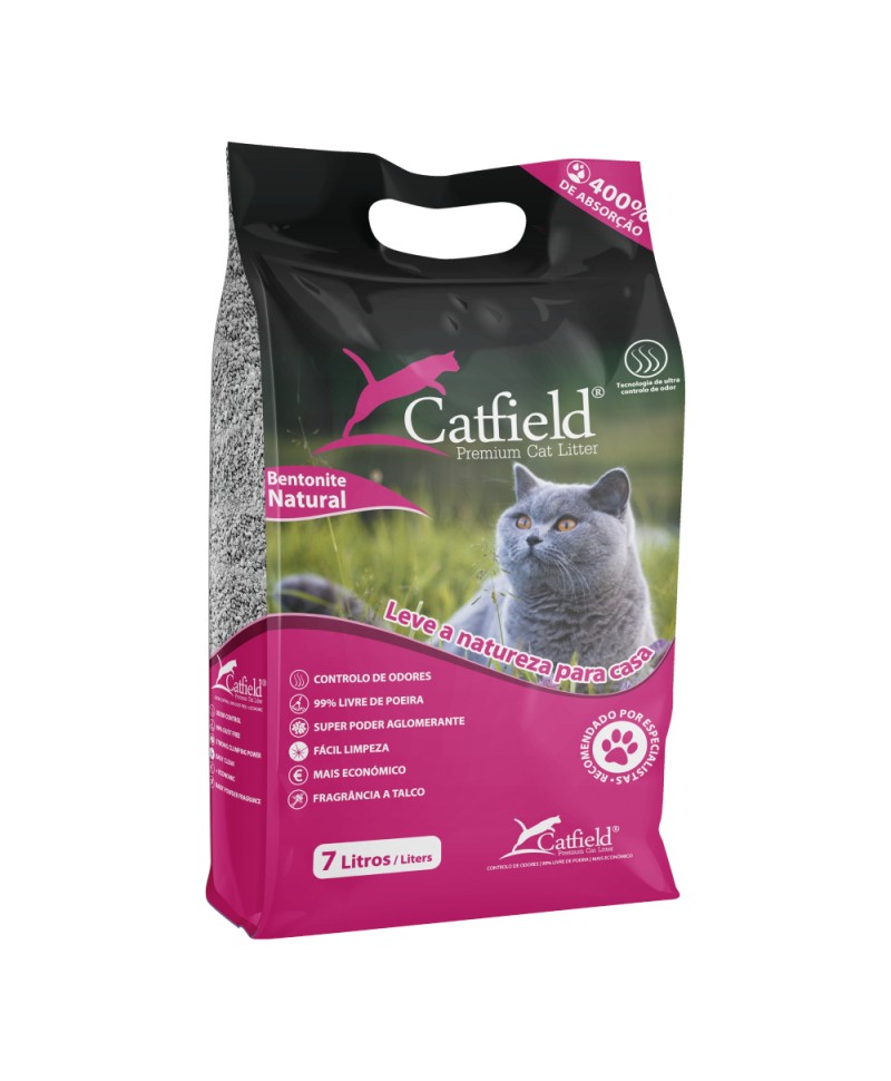Catfield Super Premium Cat Litter respeita a natureza do seu gato. Não é tóxico e, devido à dimensão média mais uniforme das partículas e ao facto de ser livre de poeiras, não se agarra ao pelo do seu animal e não provoca irritação dos olhos e nariz do seu gato. O aroma suave a pó de talco não é agressivo para o seu amigo de quatro patas.