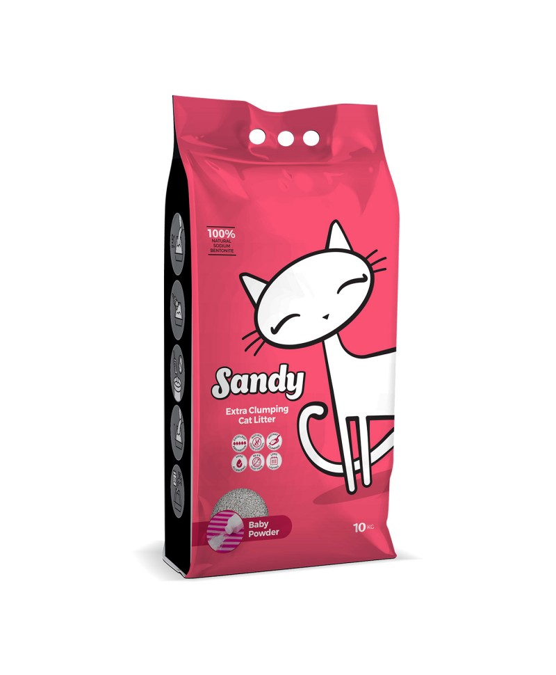 A Areia Sandy para gatos de aglomeração instantânea feita de 100% Bentonita Sódica Natural, suavemente perfumada com Pó de Talco usando ingredientes naturais. O aroma de Pó de Talco tem um efeito calmante e relaxante tanto para humanos como para gatos.