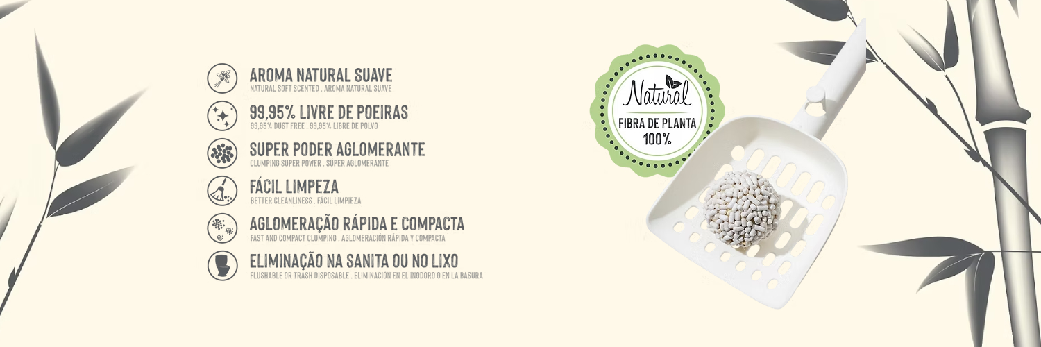 Produzida a partir de fibras vegetais como bambu e bagaço, este é um produto 100% natural, biodegradável e seguro para o seu gato. É altamente absorvente, forma aglomerados firmes que neutralizam os odores e facilitam a limpeza diária.